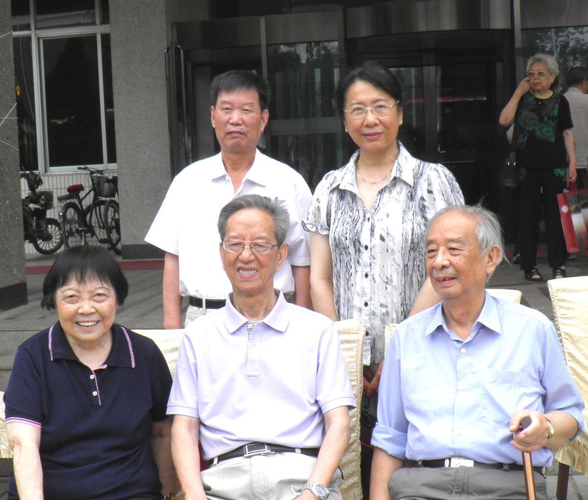 2012年6月北京大学举办汤用彤奖学金、杨辛助学金设立仪式暨杨辛教授90寿辰祝福会。午宴后,杨辛教授(前排中)与北大中国哲学暨文化研究所所长汤一介教授(前排右一)及夫人乐黛云教授(前排左一)、北大继续教育学院院长魏常海教授、华夏时报发行人于建一社长合影留念。