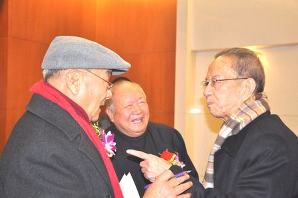 杨辛教授(右)与好友原中央美院雕塑系主任、中国国家画院雕塑院院长钱绍武教授(中,雕刻家、画家、书法家),原中央美院民间美术系主任杨先让教授(左,版画家、书法家,华夏时报荣誉顾问)在开幕式上交谈甚欢。
