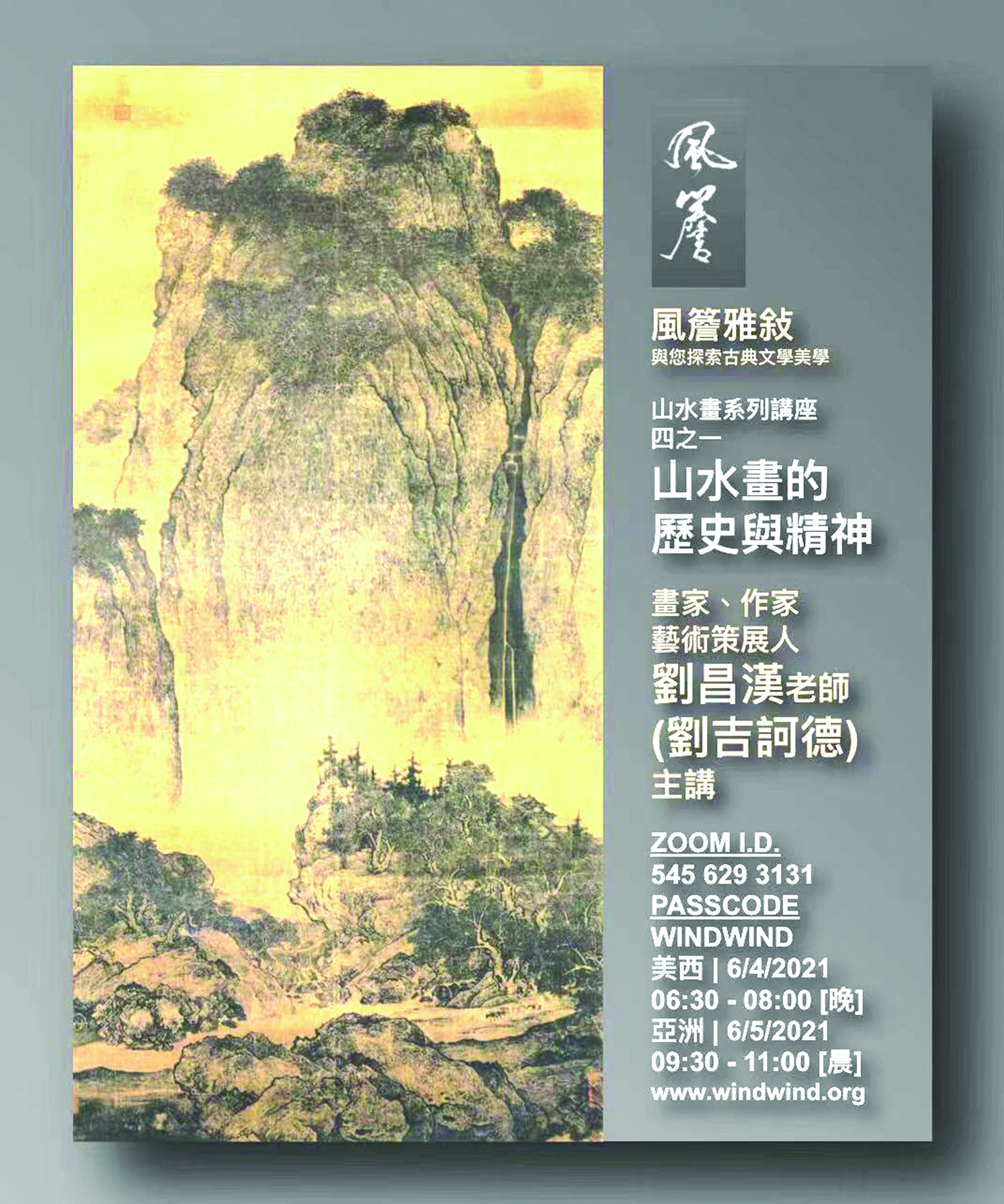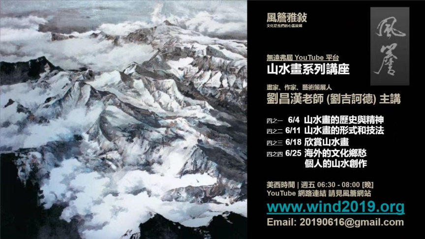 讲座的YouTube链接将公布于风簷网站www.wind2019.org。本次系列讲座综观山水画历史风貌,解析形式与技法的传承演变,每场播映约百幅山水作品欣赏,深入浅出、贯串古今,与喜爱艺术的朋友分享交流。