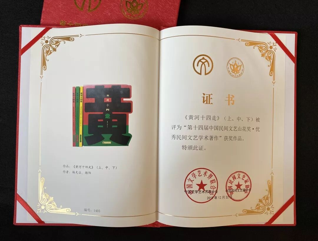 中国民间文艺“山花奖”是经中共中央宣传部批准,由中国文学艺术界联合会和中国民间文艺家协会联合主办的全国性民间文艺奖。“山花奖”以提高民间文艺作品的创作质量和艺术品位为宗旨,自1999年以来每两年一届,已经成功举办了十四届,推动了民间文艺事业的繁荣发展。此次颁奖盛典由中国文学艺术界联合会、中国民间文艺家协会主办。今年正值中华人民共和国成立70周年。第十四届中国民间文艺“山花奖”优秀民间文学作品、优秀民间工艺美术作品、优秀民间文艺学术著作、优秀民间艺术表演作品等奖项在此次颁奖盛典一一揭晓。这些作品,有的积淀多年,有的有感于新时代新气象而作;有的来自西部边陲,有的来自东海之滨,更有的出自改革创新发祥地。民间底色,当代精神。秉承创造性转化、创新性发展的理念,“山花奖”评委会在来自全国30多个省市自治区的作品里,遴选出上述四类共20个优秀作品。其中,著名艺术家杨先让和清华美院教授、女儿杨阳撰写的《黄河十四走》一书获得第十四届中国民间文艺山花奖·学术著作奖,35年前的辛劳开拓换来山花烂漫。