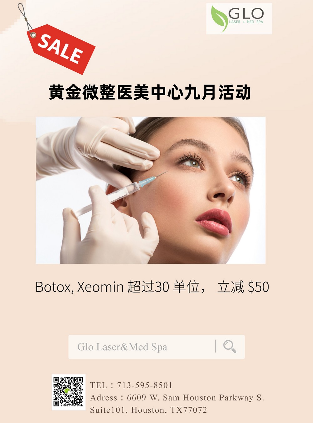 黄金微整医美中心是爱美人士的贴心朋友,9月的优惠项目:Botox、Xeomin超过30单位,立减\$50。预约电话:713-595-8501,或加微信:VMeiMD。网站:www.glolaserandmedspa.com。地址:6609W.Sam Houston Pkwy S.,Suite101,Houston。(黄金医美微整中心提供《美容大师》公众号文章)