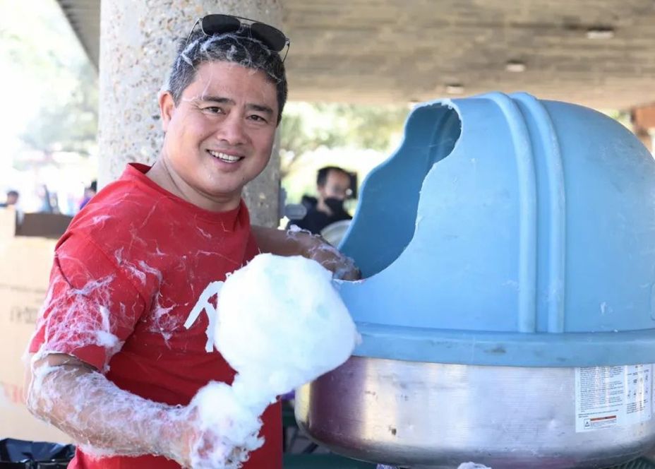上午10点,曾文军,杨德清,陈浩(副会长),王栋等带领各位义工到现场布置聚会地点,挂上清华大学的校旗,铺设紫荆花同色桌布,摆放路标,搭设蹦蹦屋。棉花糖摊子也摆起来了。烧烤组的义工们生起了炭火,烤羊肉、牛仔骨和热狗。