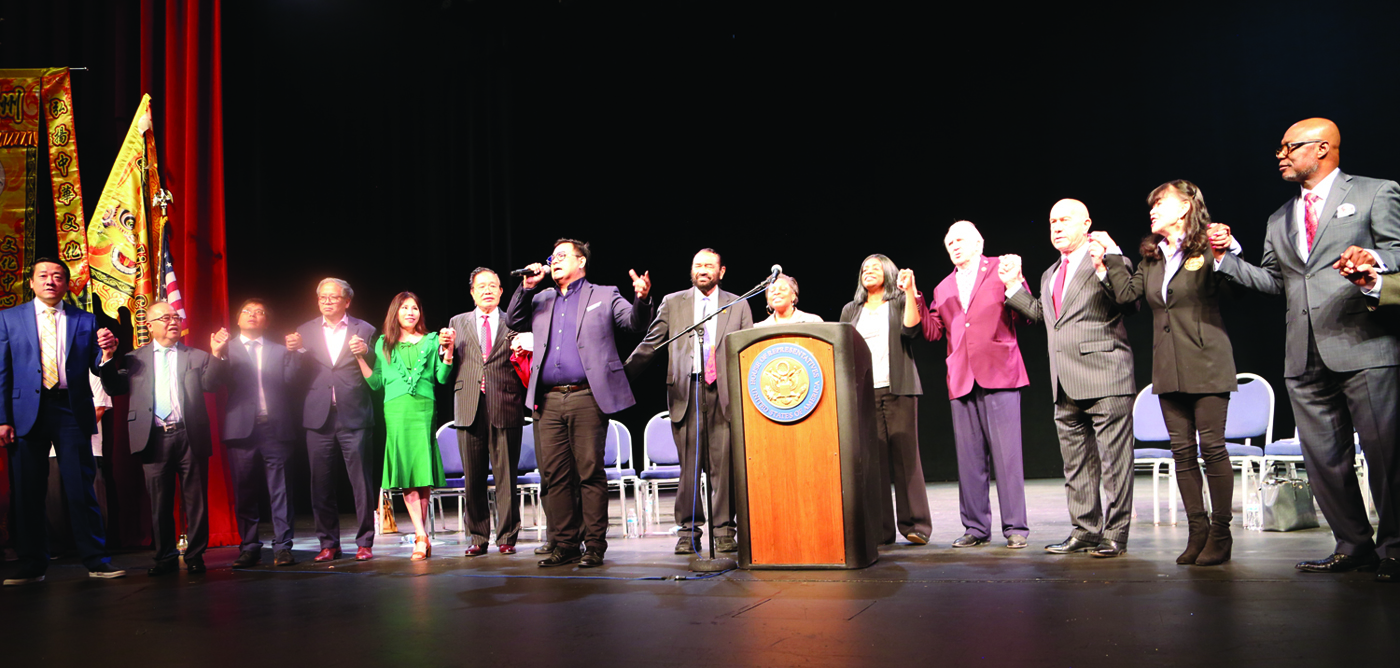 华裔歌手蔡毅深情演唱《America the Beautiful》,台上的多位民选官员和社区领袖手挽手一起合唱,把现场民众情绪推向高潮。