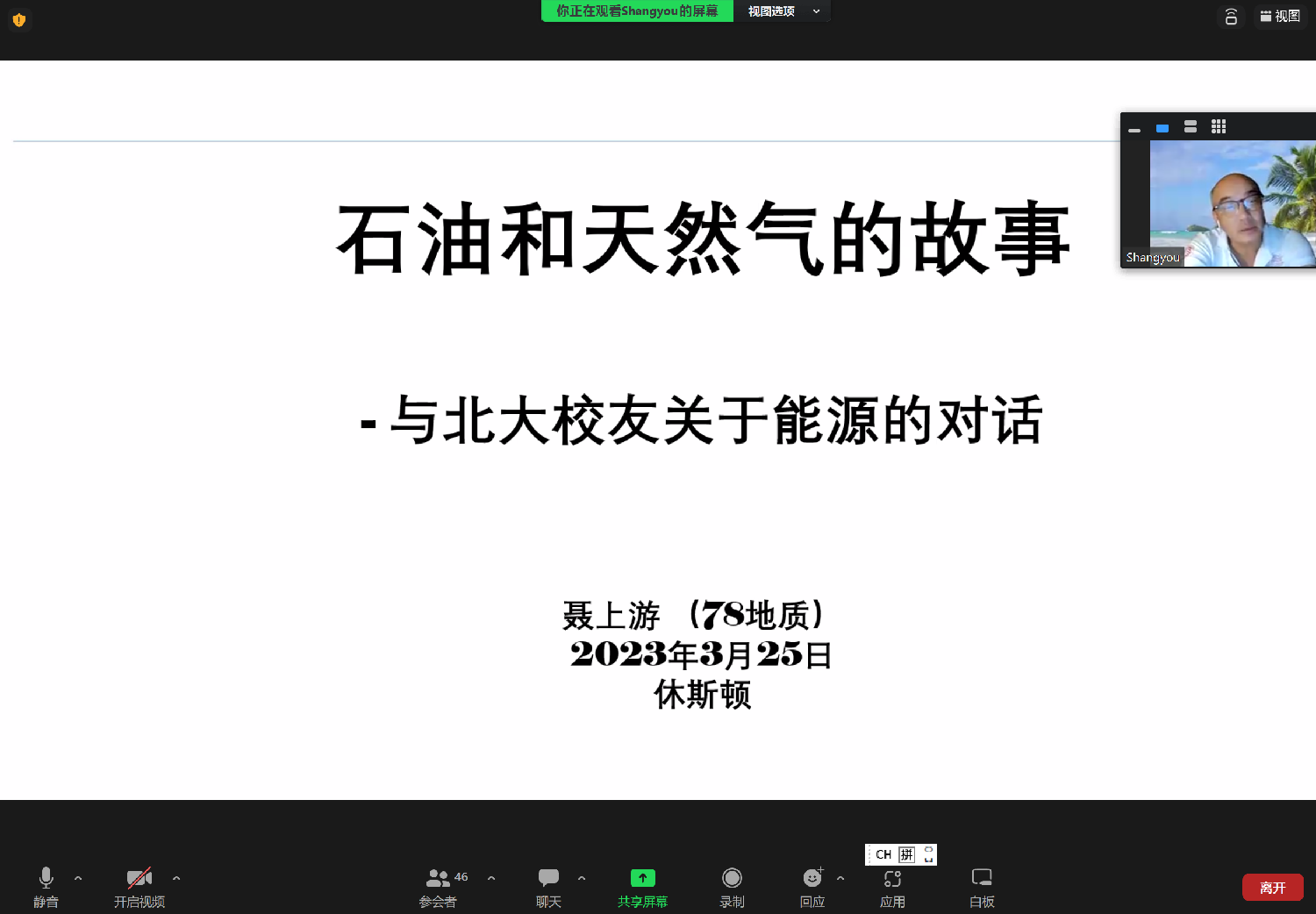 【本报记者慕石报道】休斯敦北大校友会3月25日举办博雅论坛系列第一讲。由校友会资深理事吴薇主持,邀请资深能源专家聂上游博士进行线上能源科普讲座:《石油和天然气的故事》。休斯敦和达拉斯的北大校友、休斯敦社区关注能源的各界人士50多人参加,讲座取得巨大成功,获得广泛好评。