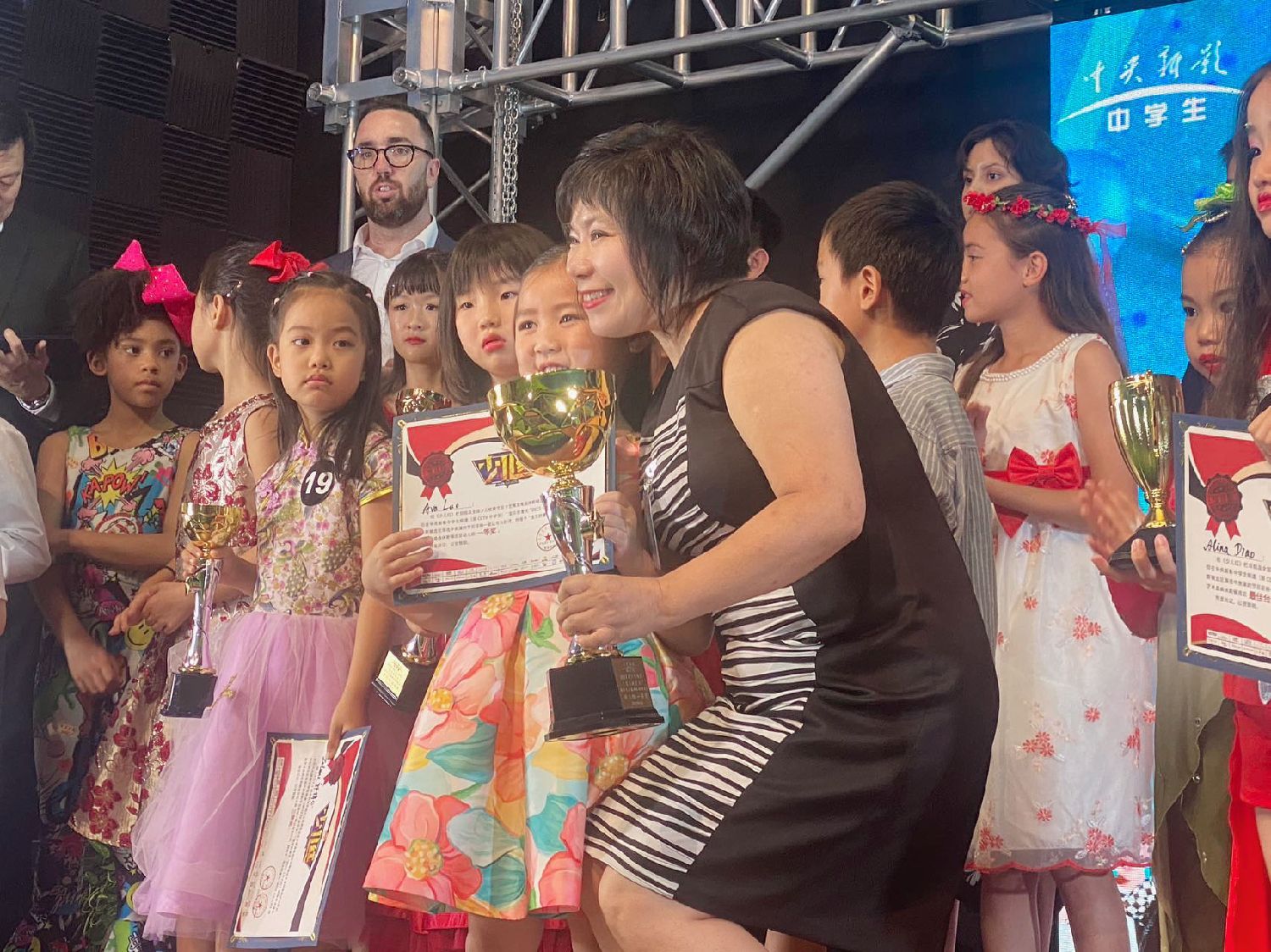 美南新闻集团董事长李蔚华先生颁发少儿组一等奖,获奖者:季子兮MorganDowd,何心潆OliviaHe