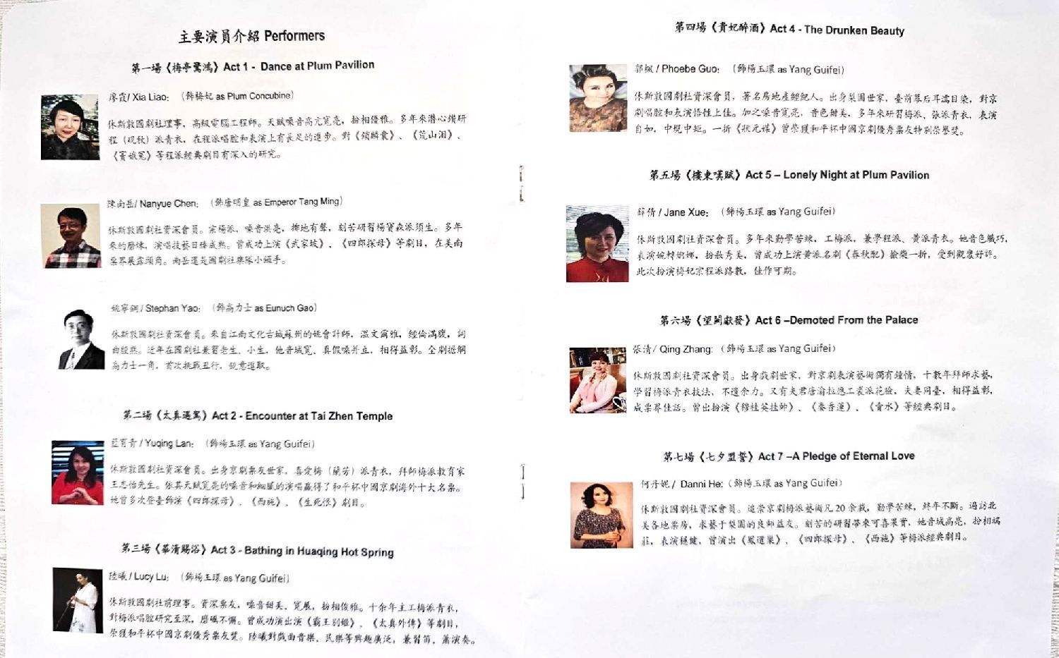 唐代著名诗人白居易的长篇叙事诗《长恨歌》,描述了唐玄宗和杨贵妃的爱情悲剧。梅兰芳、程艳秋等京剧大师以优美的唱腔和精湛的表演把这被誉为“千古绝唱”的文化经典展现于传统京剧舞台。《明皇宠妃》以经典剧目《太真外传》、《贵妃醉酒》和《梅妃》为蓝本,连贯成七幕本戏。全部演员和乐队均由休斯敦国剧社社员组成,演出展现了中华国粹之美及京剧艺术在海外的传承。演员们的精彩表演,博得戏迷观众的赞誉和热烈的掌声,得到很大反响。