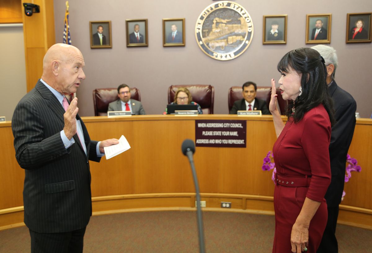 在当晚的市议会会议中,谭秋晴再次被推选为斯塔福市副市长,左为市长Ken Mathew