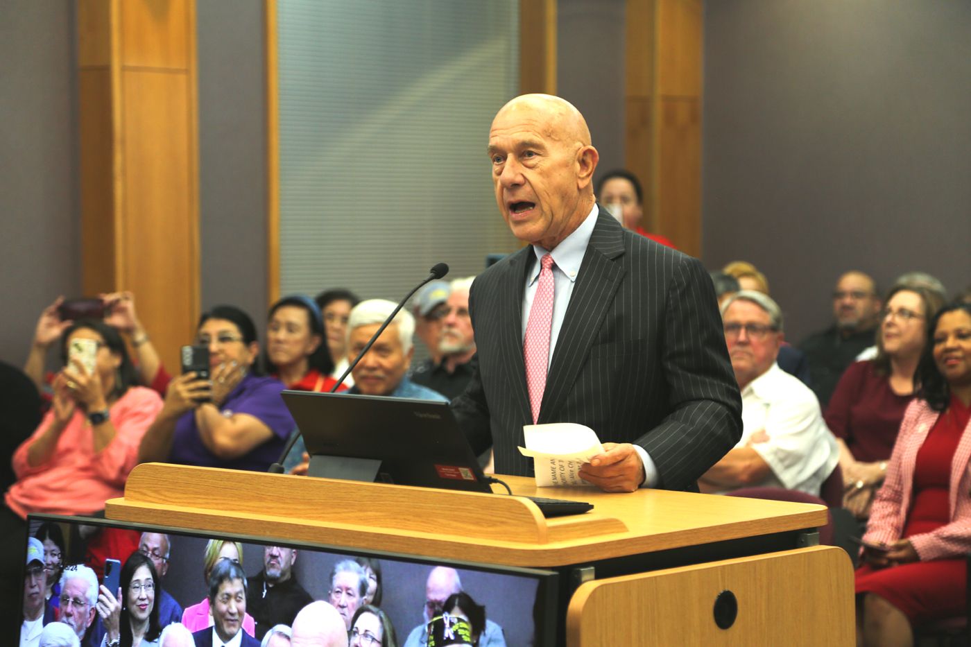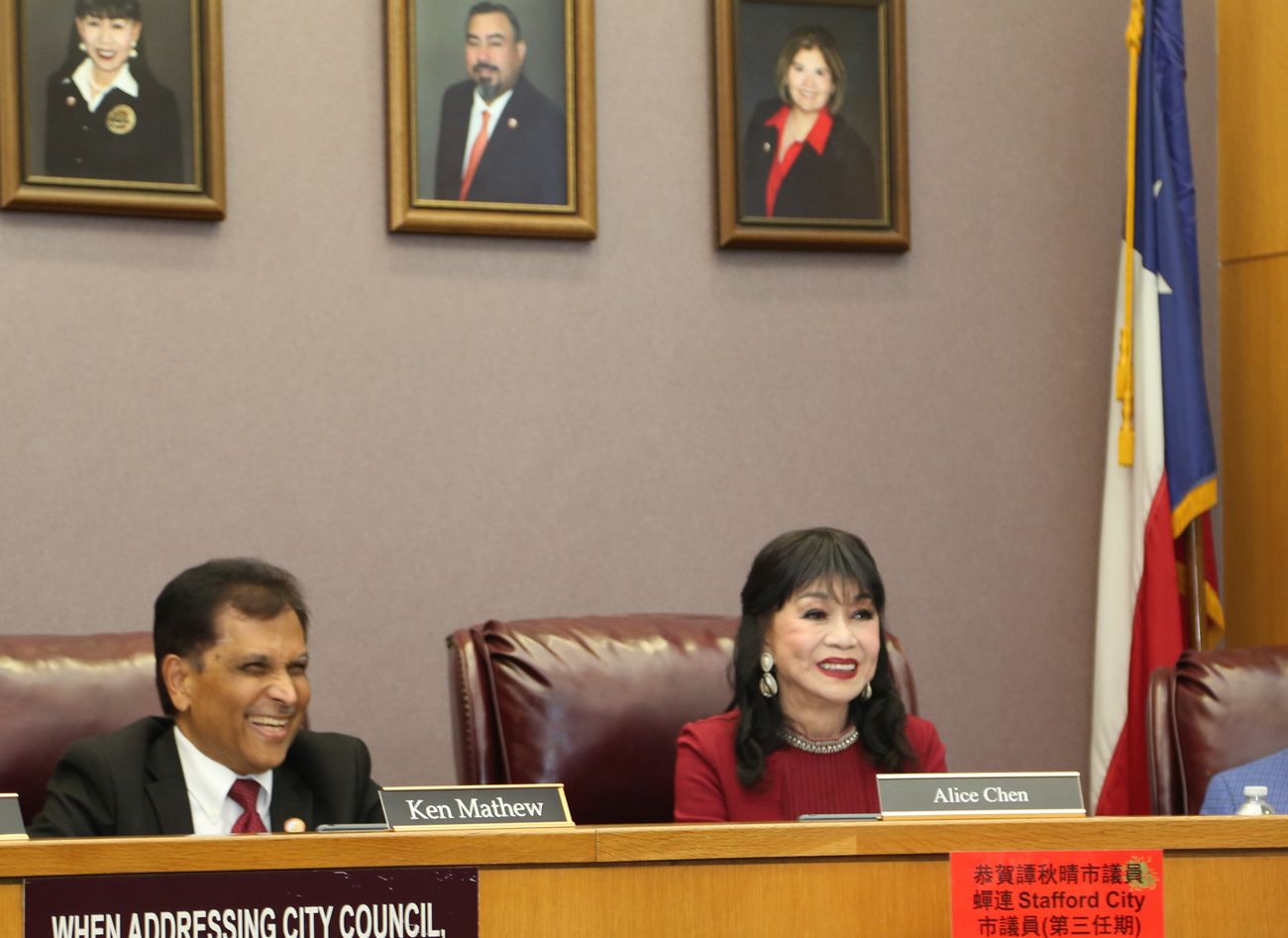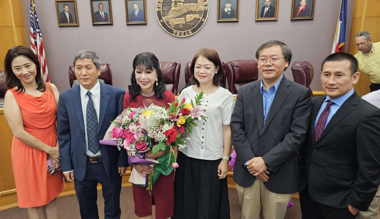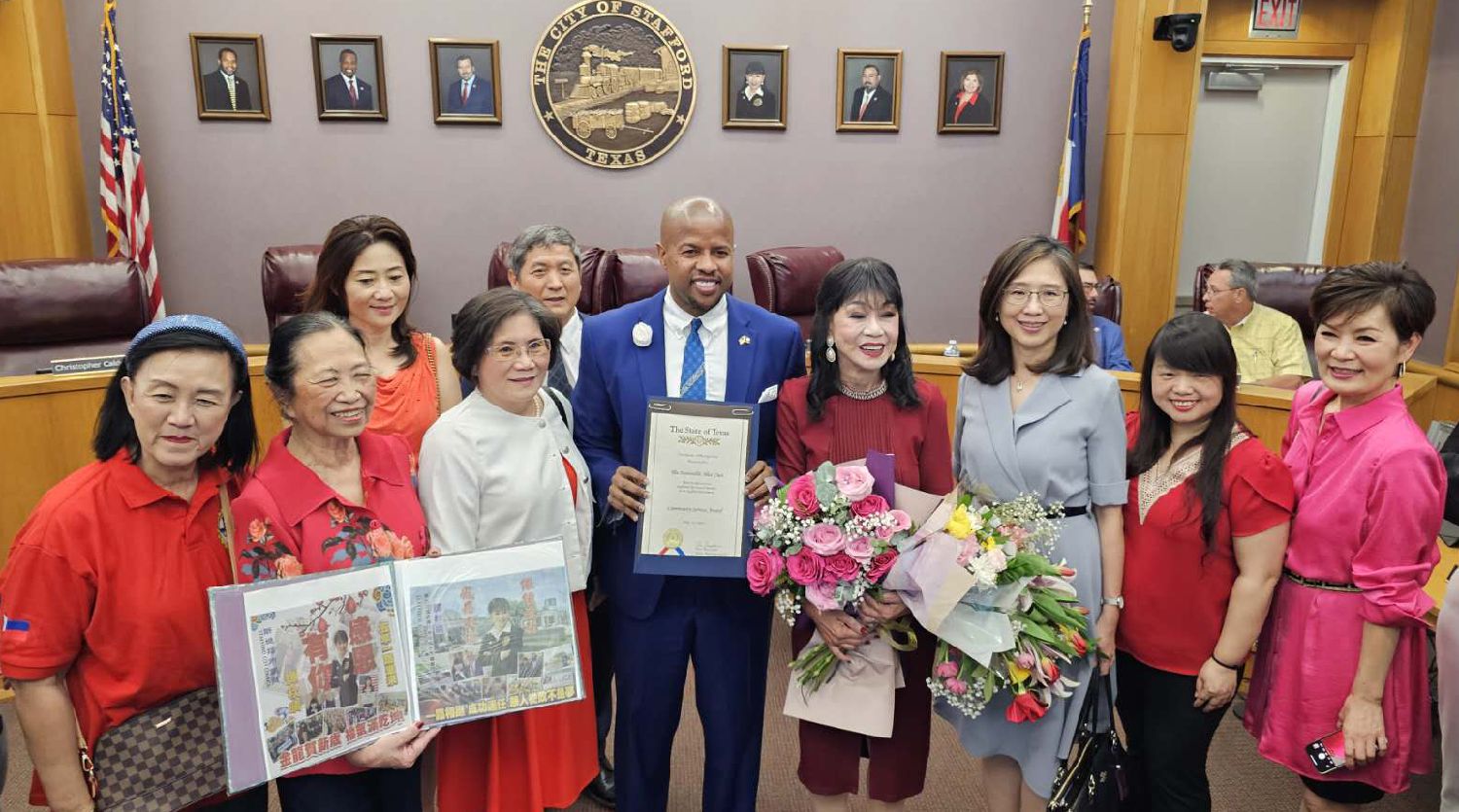 【本报记者慕石报道】在最近斯塔福市(City of Stafford)市议员选举中,谭秋晴(Alice Chen)以71%选票的绝对优势击败竞争对手,开启第三届连任的里程。5月15日晚,休斯敦市长惠特迈尔(John Whitmire)亲临斯坦福市政厅为谭秋晴主持就职典礼,以特别表示支持。他高度赞扬谭秋晴议员五年为多元文化发展、社区建设、教育等方面所做出的突出贡献。
