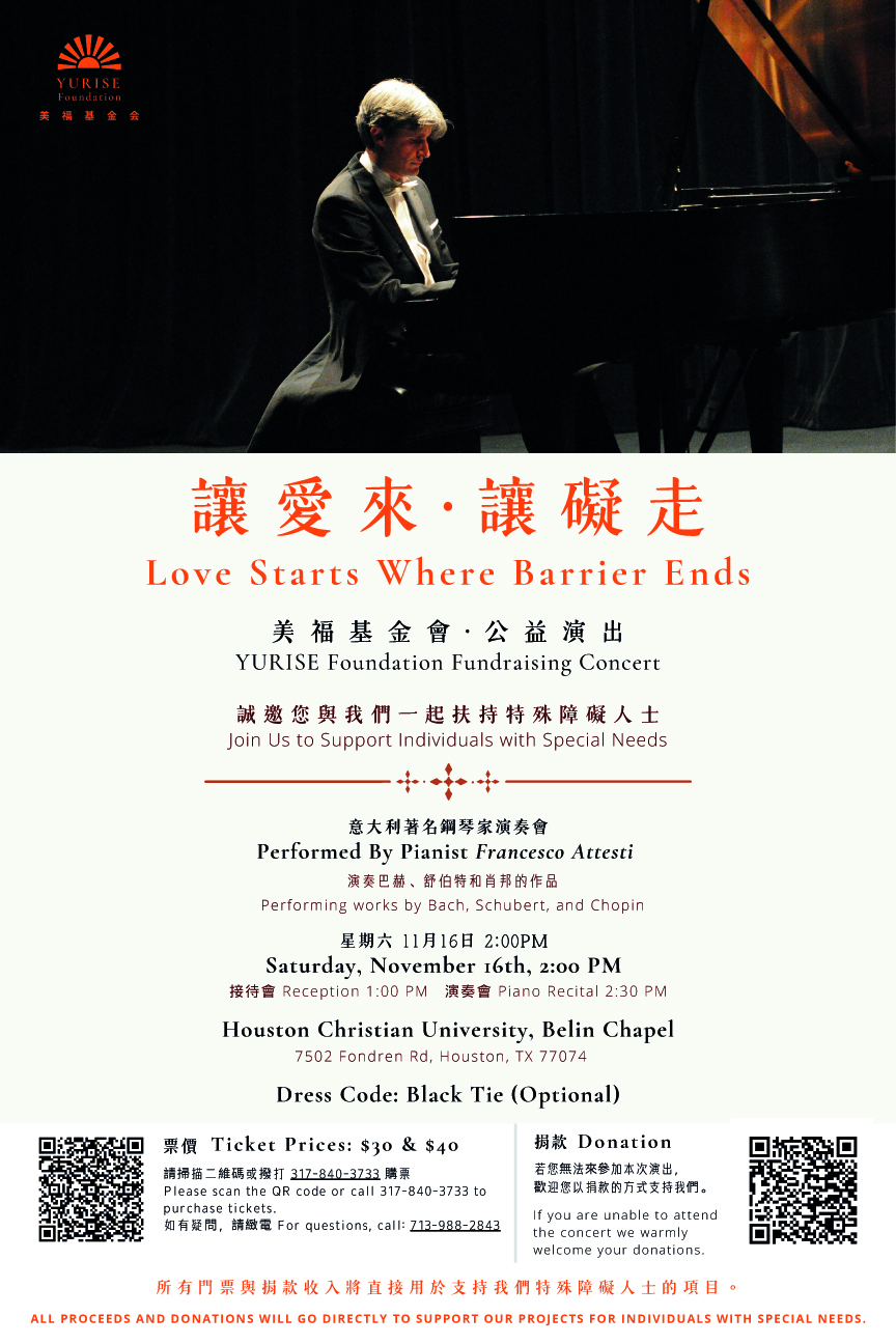 【本报记者慕石报道】美福基金会(YURISE Foundation)11月16日在休斯敦基督教大学(HCU)贝林音乐厅举行题为《让爱来–让碍走》公益音乐会,通过音乐传播爱心与温暖,为支持特殊需求的亚裔家庭筹集善款。