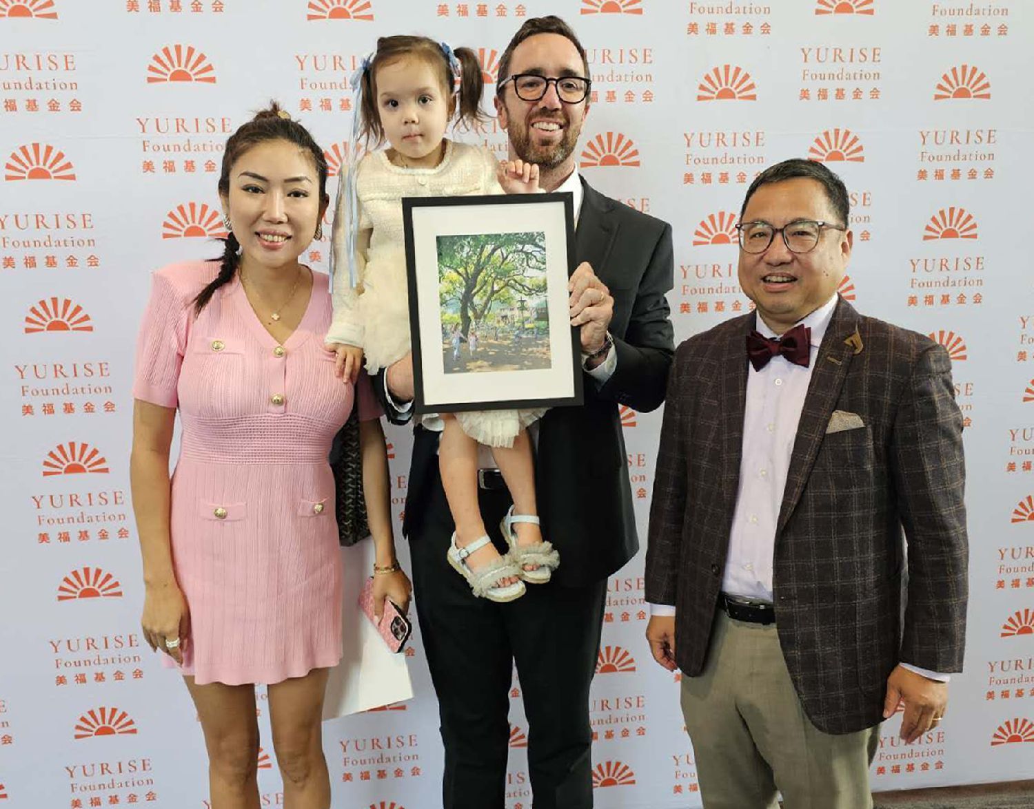 Fulshear 市议员 Patrick Powers(王力}携妻子Victoria Jiao及女儿参加音乐会并购买特殊家庭成员的绘画作品给予支持。右一为美福基金会董事会主席喻斌。