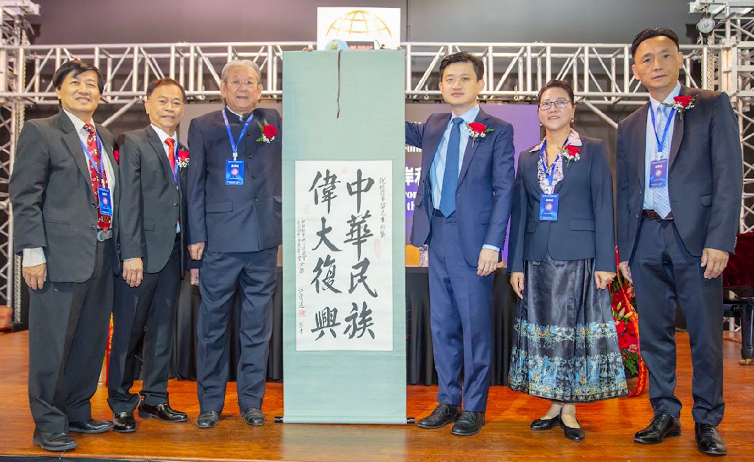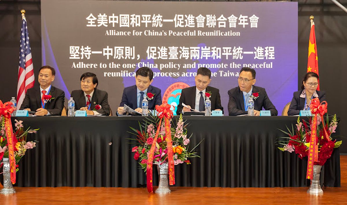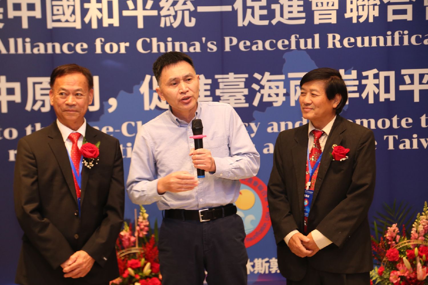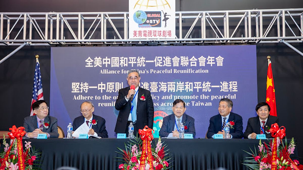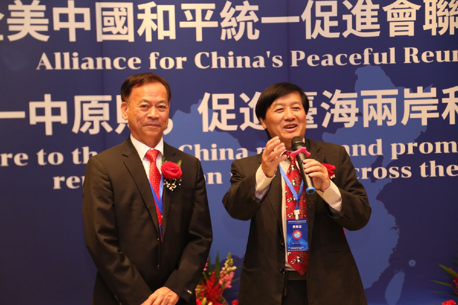 台湾政大关系研究所教授严震生、台湾新党主席吴成典、台湾统一联盟党主席戚嘉林、全美和统会联合会荣誉会长花俊雄、得克萨斯州中国和平统一促进会会长刘志恒等在主席台上