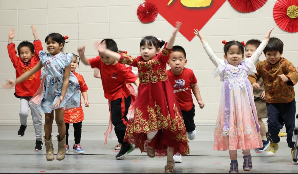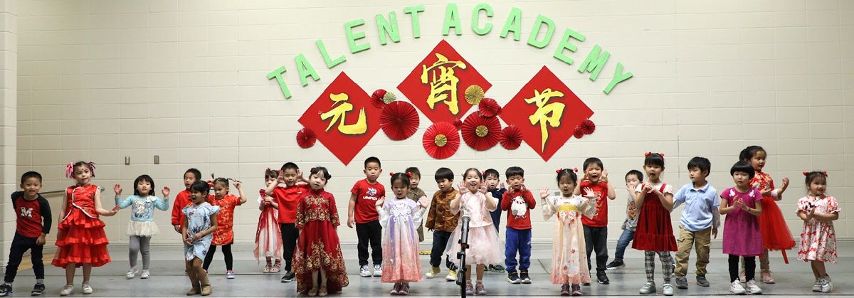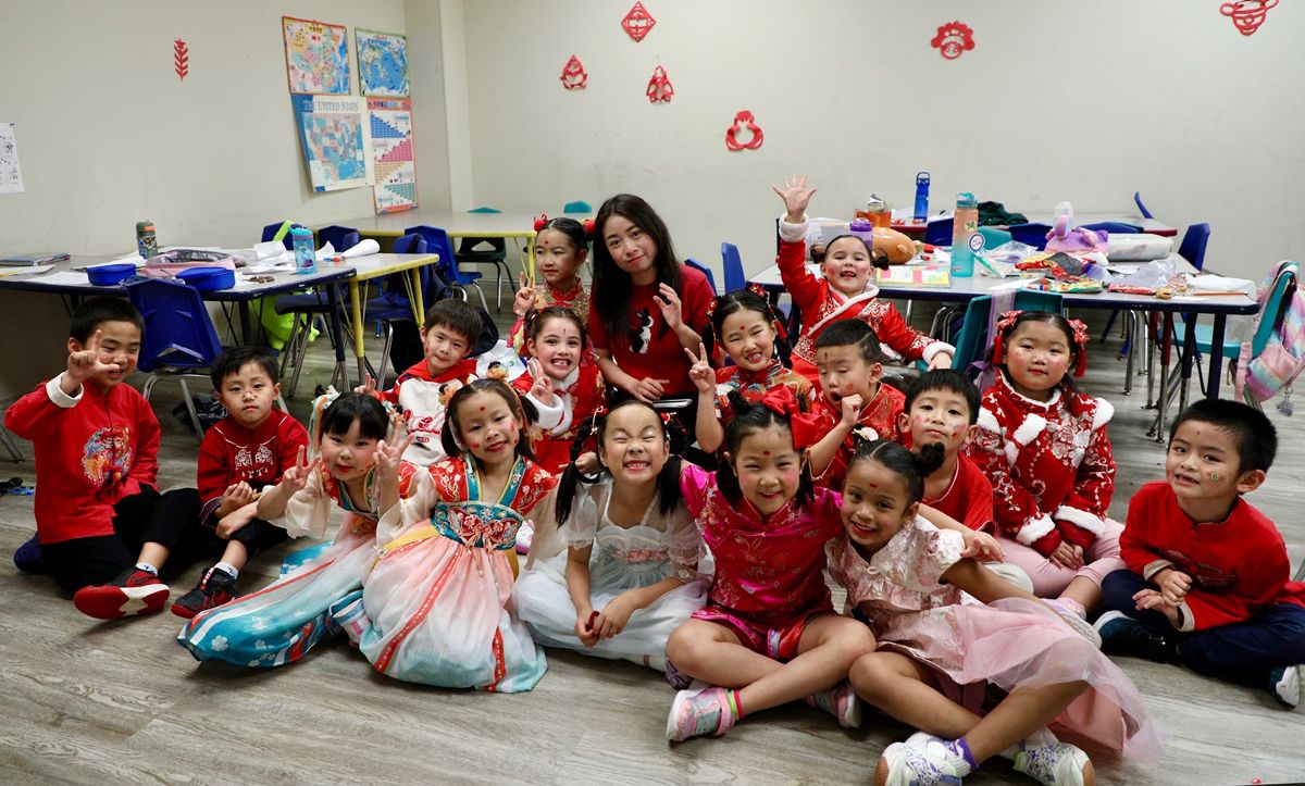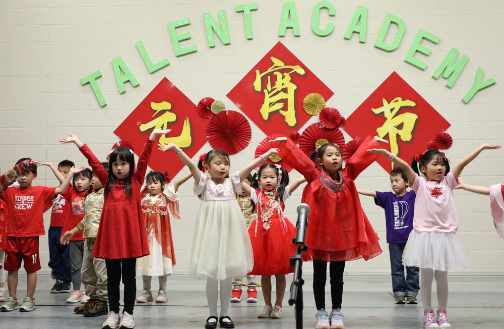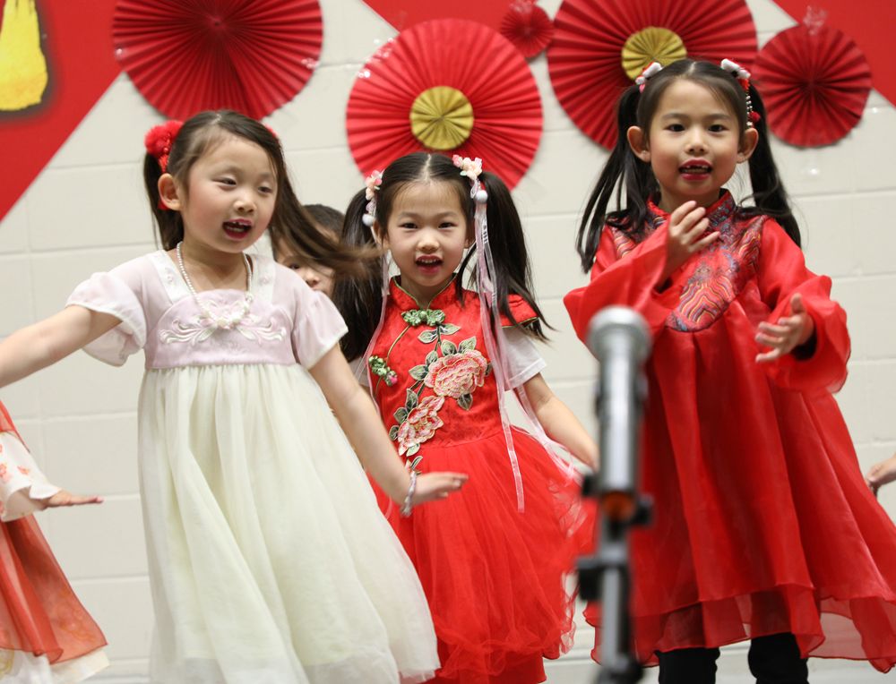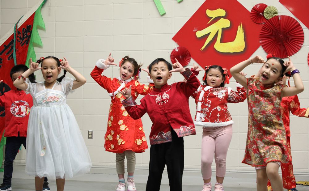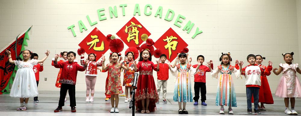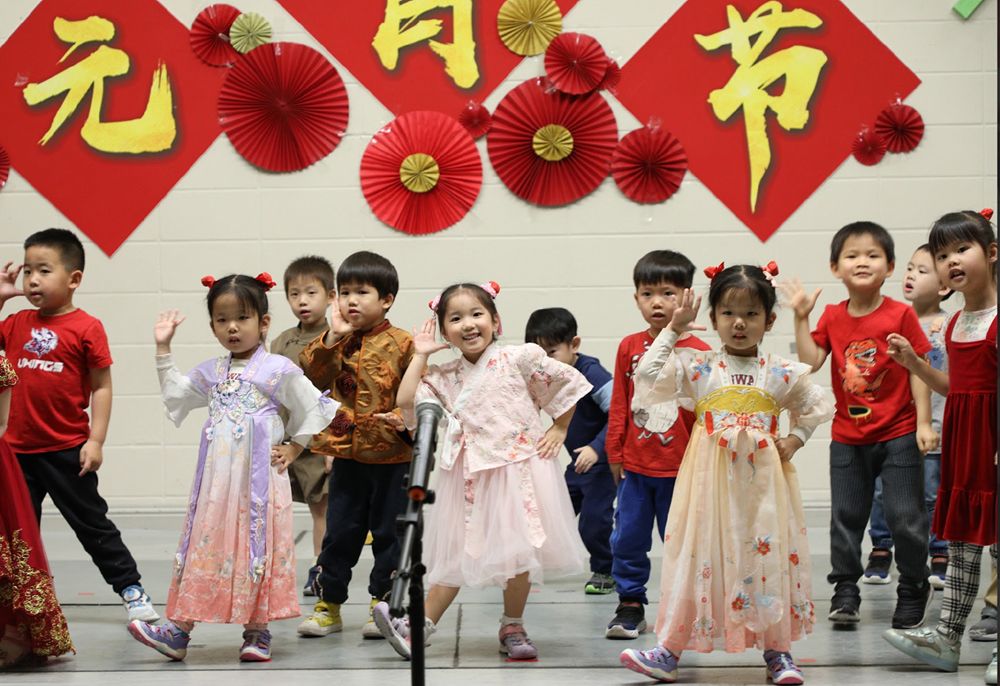 学校大厅张灯结彩,一派喜气洋洋,孩子们都穿着中华传统服装,