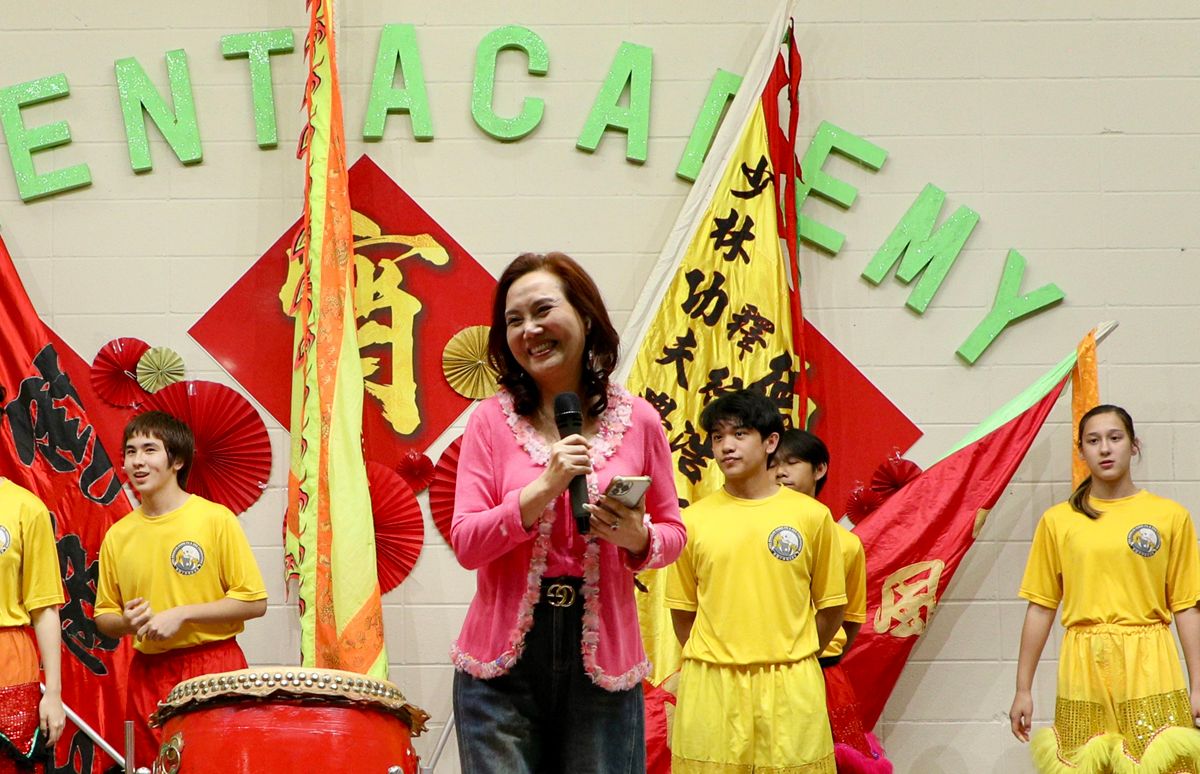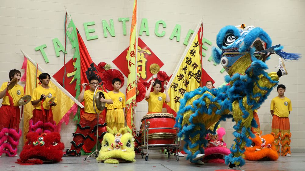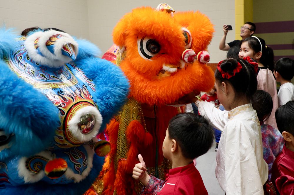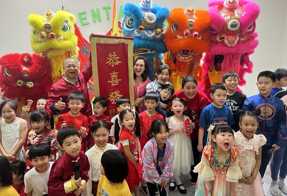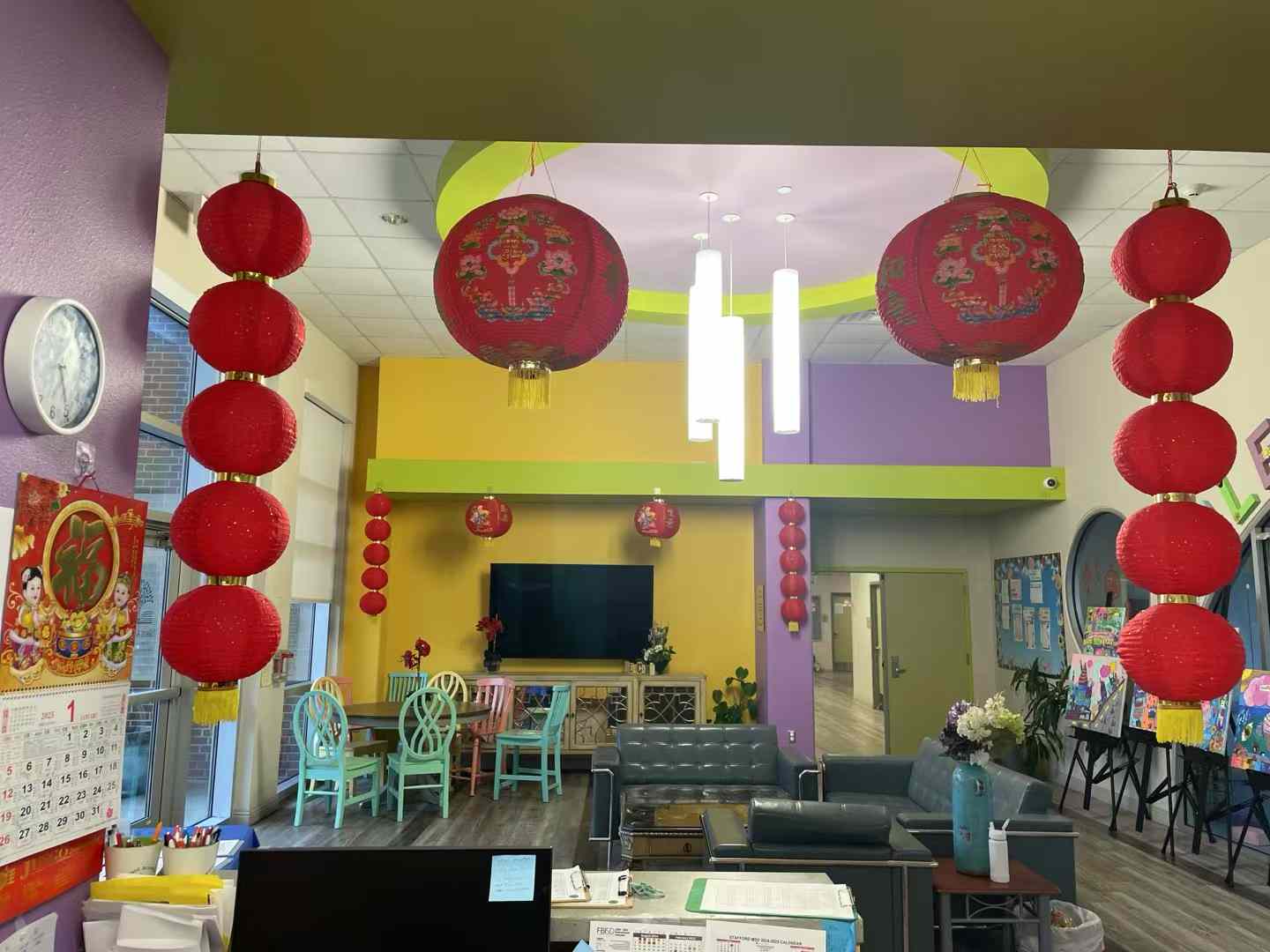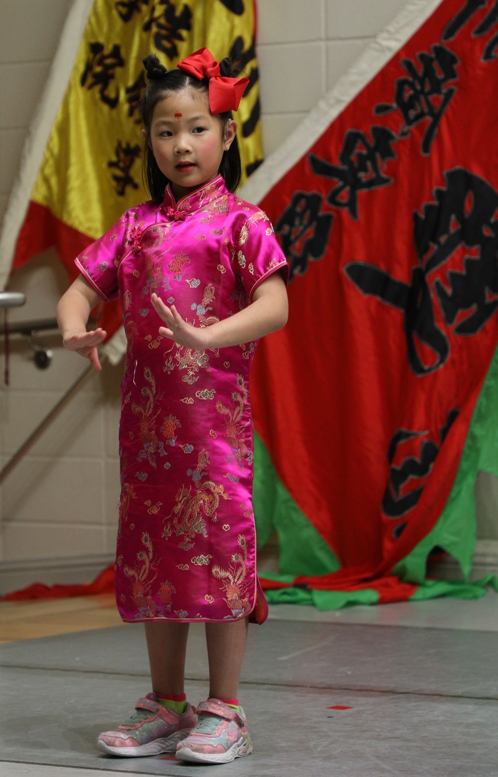 学校大厅张灯结彩,一派喜气洋洋,孩子们都穿着中华传统服装,