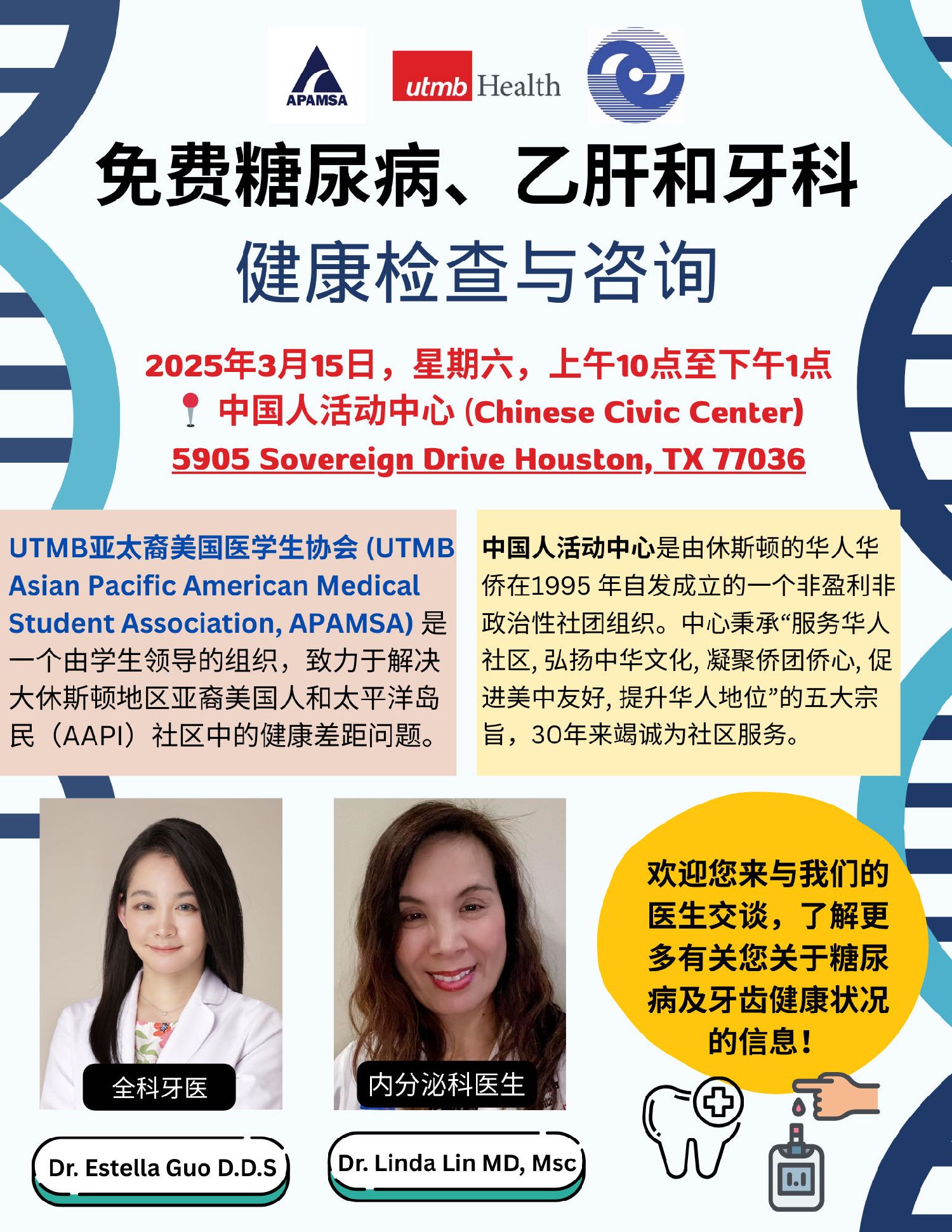 UTMB亚太裔美国医学生协会 (UTMB Asian Pacific American Medical Student Association, APAMSA) 和中国人活动中心(Chinese Civic Center)将于3月15日星期六上午10点-下午1点在中国人活动中心举办免费健康检查与咨询活动,