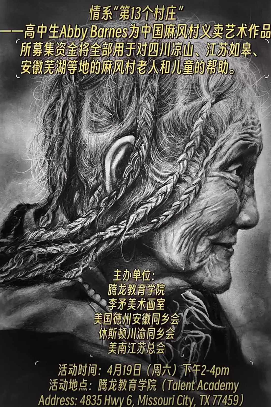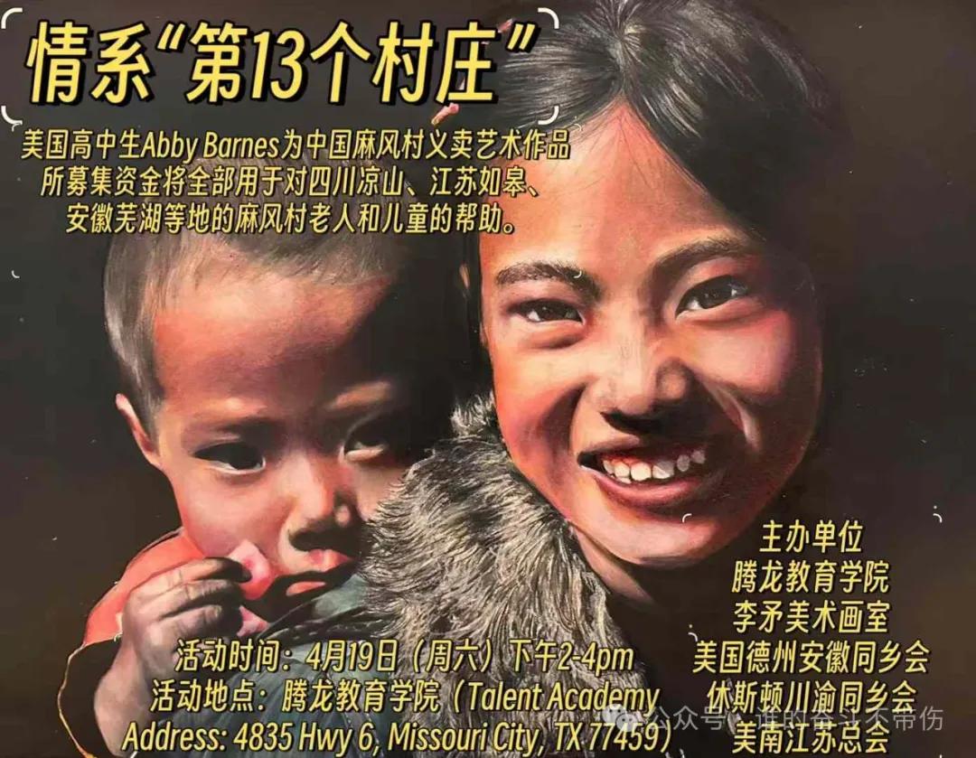 【本报记者慕石报道】“中国麻风村公益行义卖活动”4月19日在腾龙教育学院举行。此次义卖由美国高中生Abby Barnes和作家赵美萍联合发起,由腾龙教育学院、李矛美术画室、德州安徽同乡会、休斯敦川渝同乡会、美南江苏总会联合主办。活动现场展出并义卖来自李矛美术画室八位同学的艺术作品。