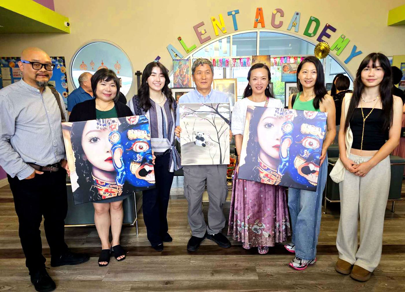 国会议员的亚裔代表张晶晶(左二)、安稳保险负责人杨德清(中)、美南江苏总会会长陈晓华(右二)购买义卖画作。