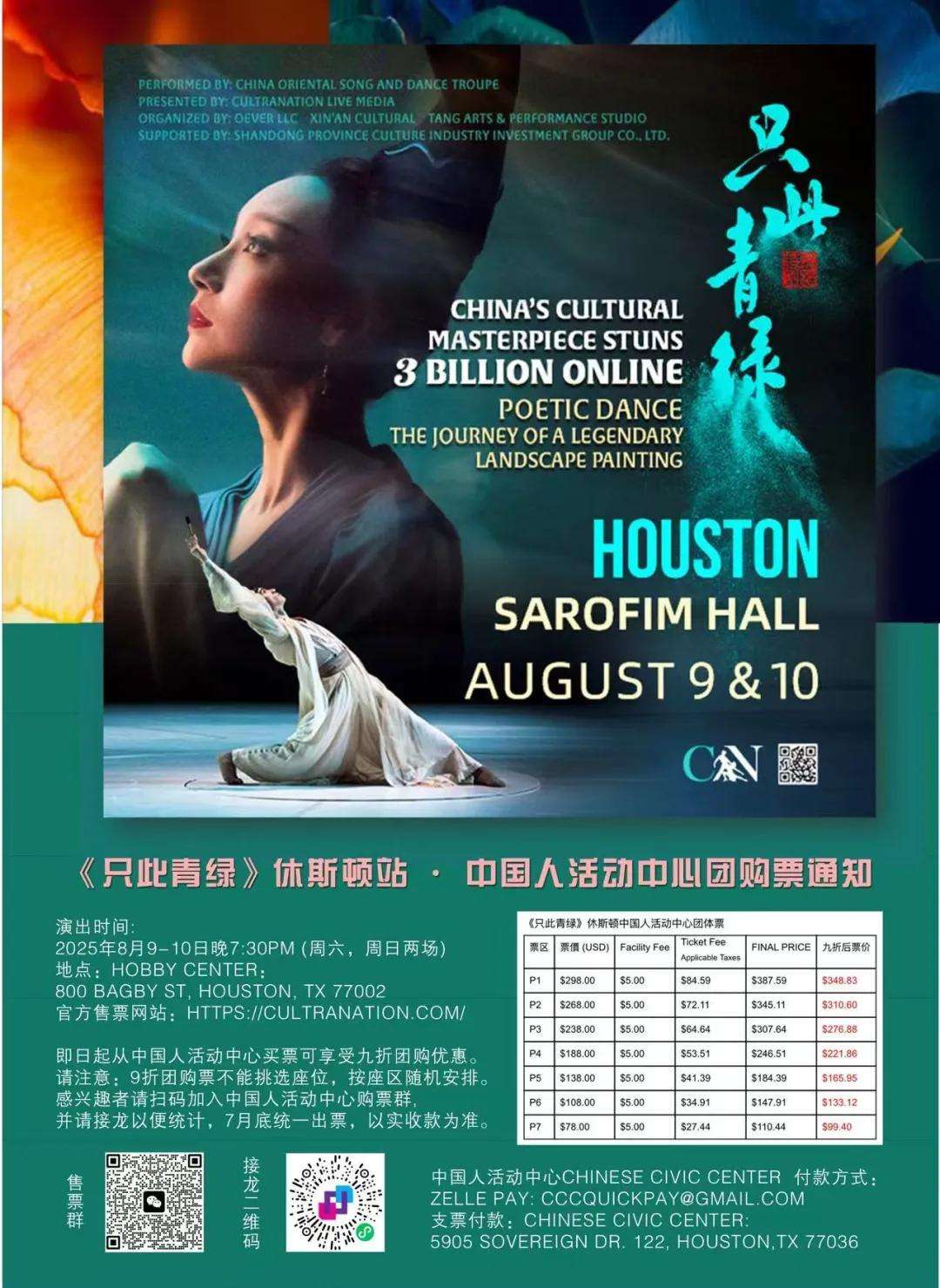 备受瞩目的现象级国风舞剧《只此青绿》,即将开启北美巡演(温哥华、西雅图、洛杉矶、休斯敦),休斯敦站演出将于8月9日和10日在 Hobby Center 华丽亮相。《只此青绿》以舞蹈绘就一幅流动的《千里江山图》,展开“青绿千载,山河无垠”的唯美画卷。机会宝贵,不可错过!