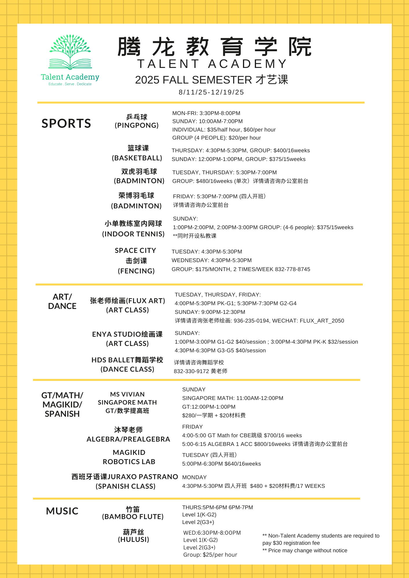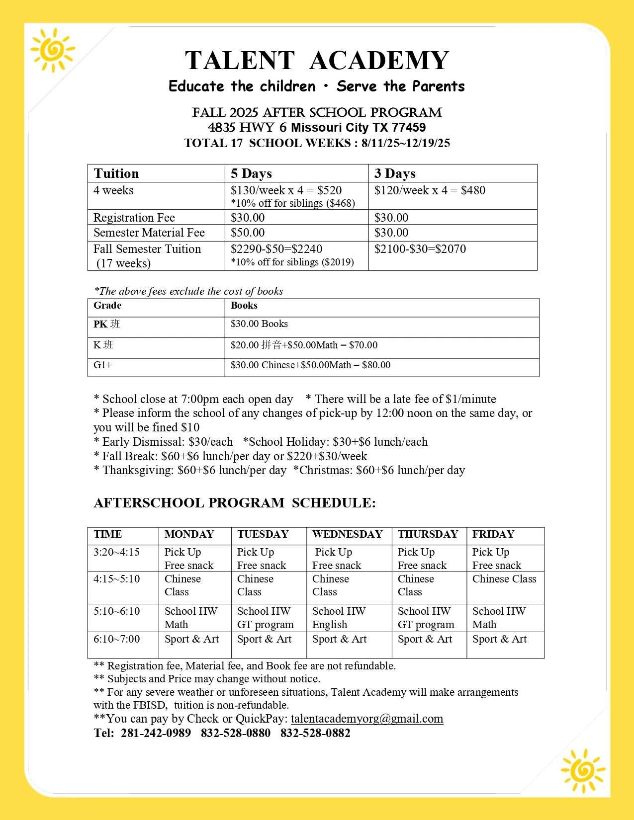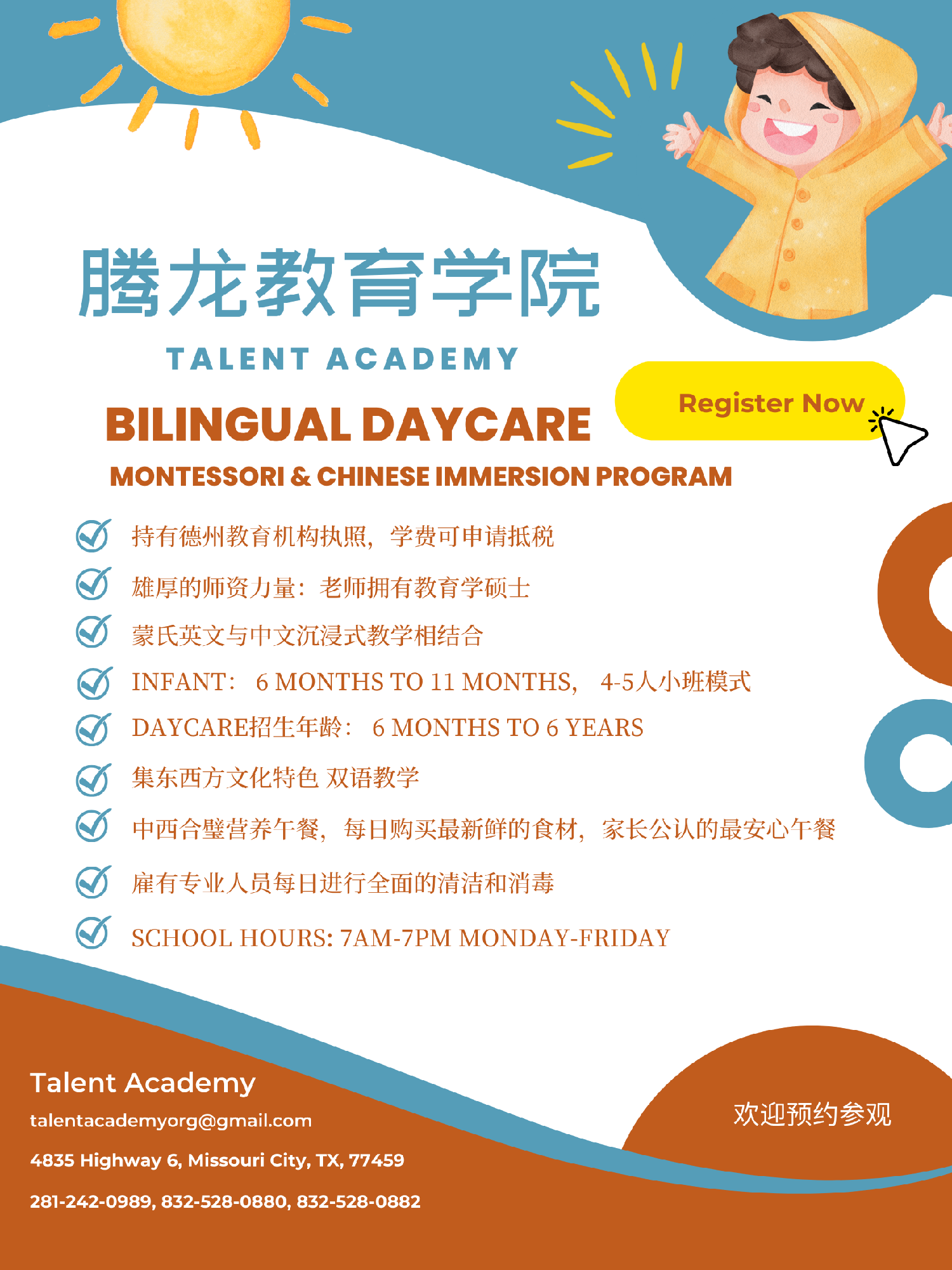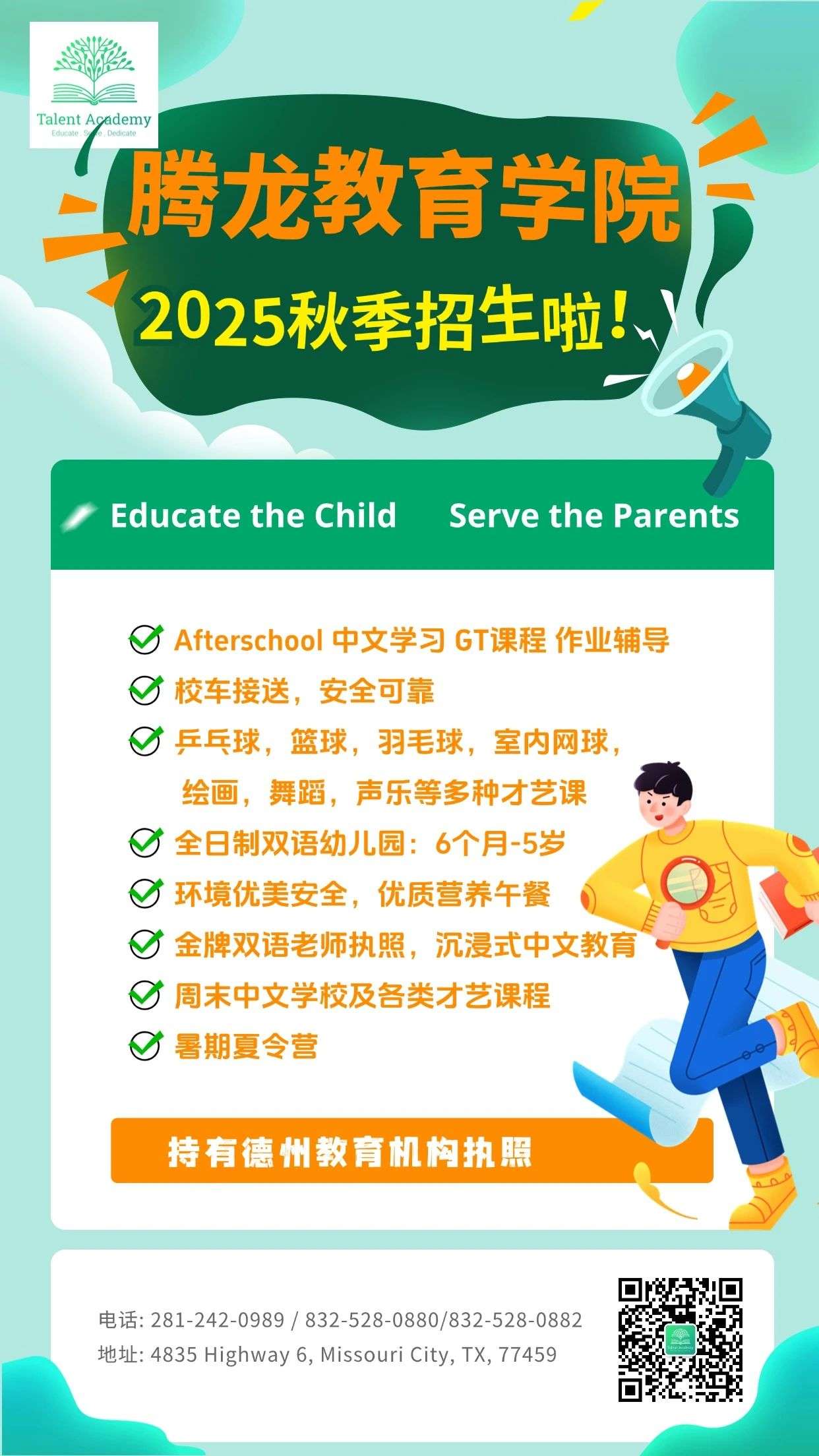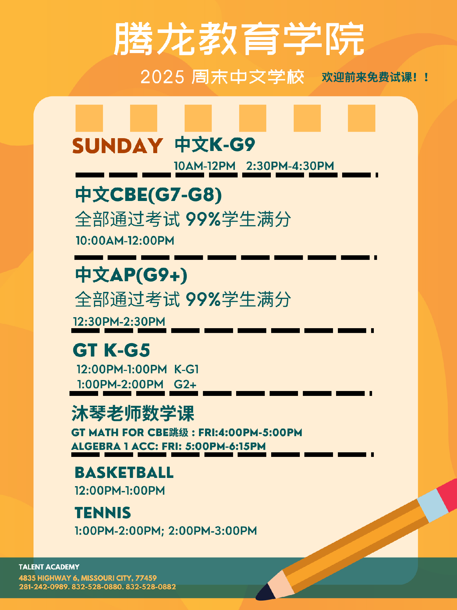 咨询及报名电话:281-242-0989;地址:4835 HWY 6,Missouri City,TX77459。
