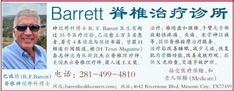 【本报记者慕石报道】脊椎病痛是一种常见病,许多人都经受过其困扰,能找到一位医术高明、认真负责的医生是脊椎病患者的福分。巴瑞特脊椎治疗诊所(Barrett Chiropractic Clinic)提供优质贴心的诊断和理疗服务,在大休斯敦地区建立了良好的口碑。