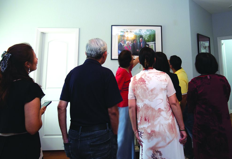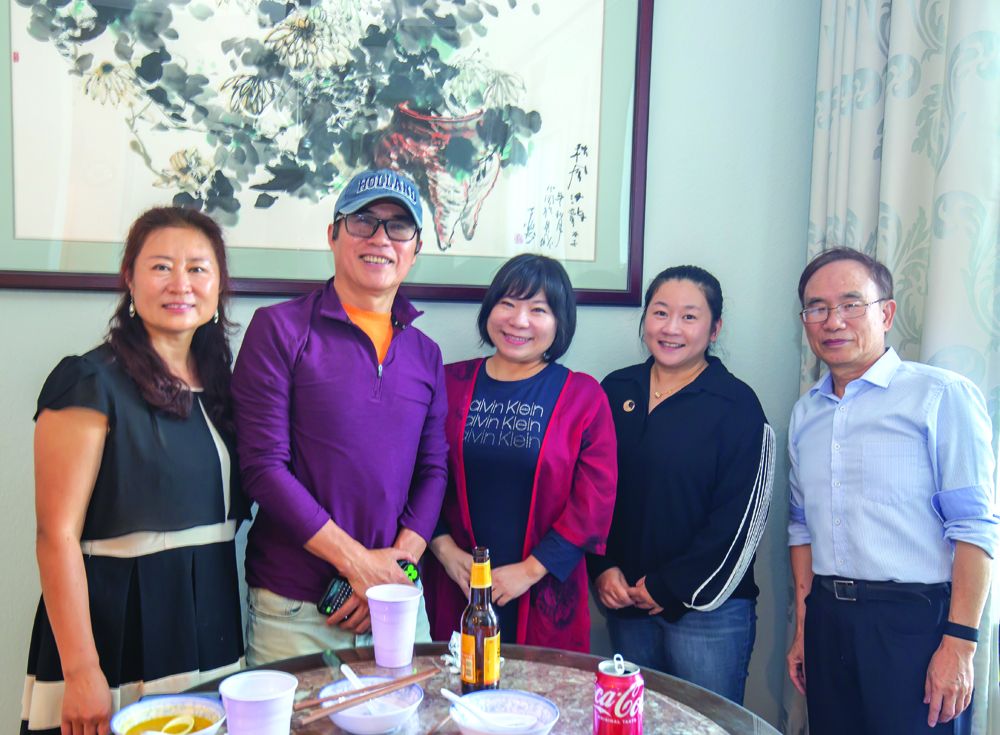 斯坦福市副市长谭秋晴女士(左五)及其先生(右一)与“民”同乐。