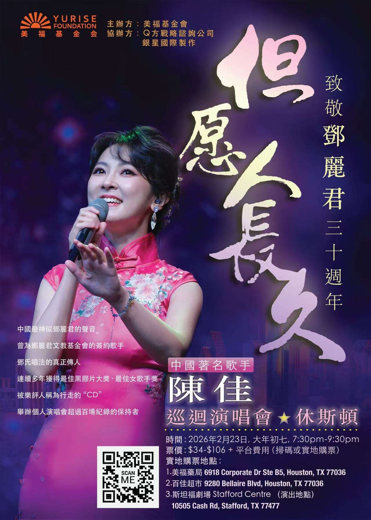 三十年光阴流转,经典从未远去。2月23日,陈佳将在休斯敦,用歌声再度唤醒那些温柔而坚定的时代记忆。