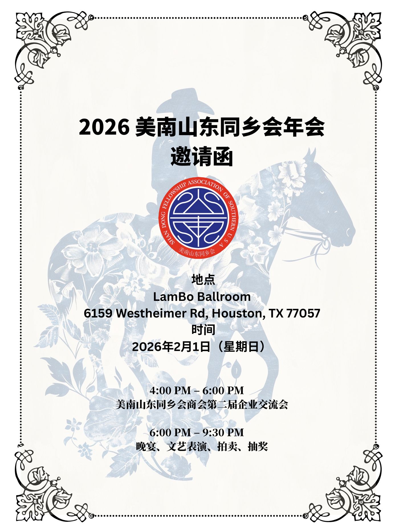 【本报讯】美南山东同乡会将于2月1日(星期日)召开年会,预计