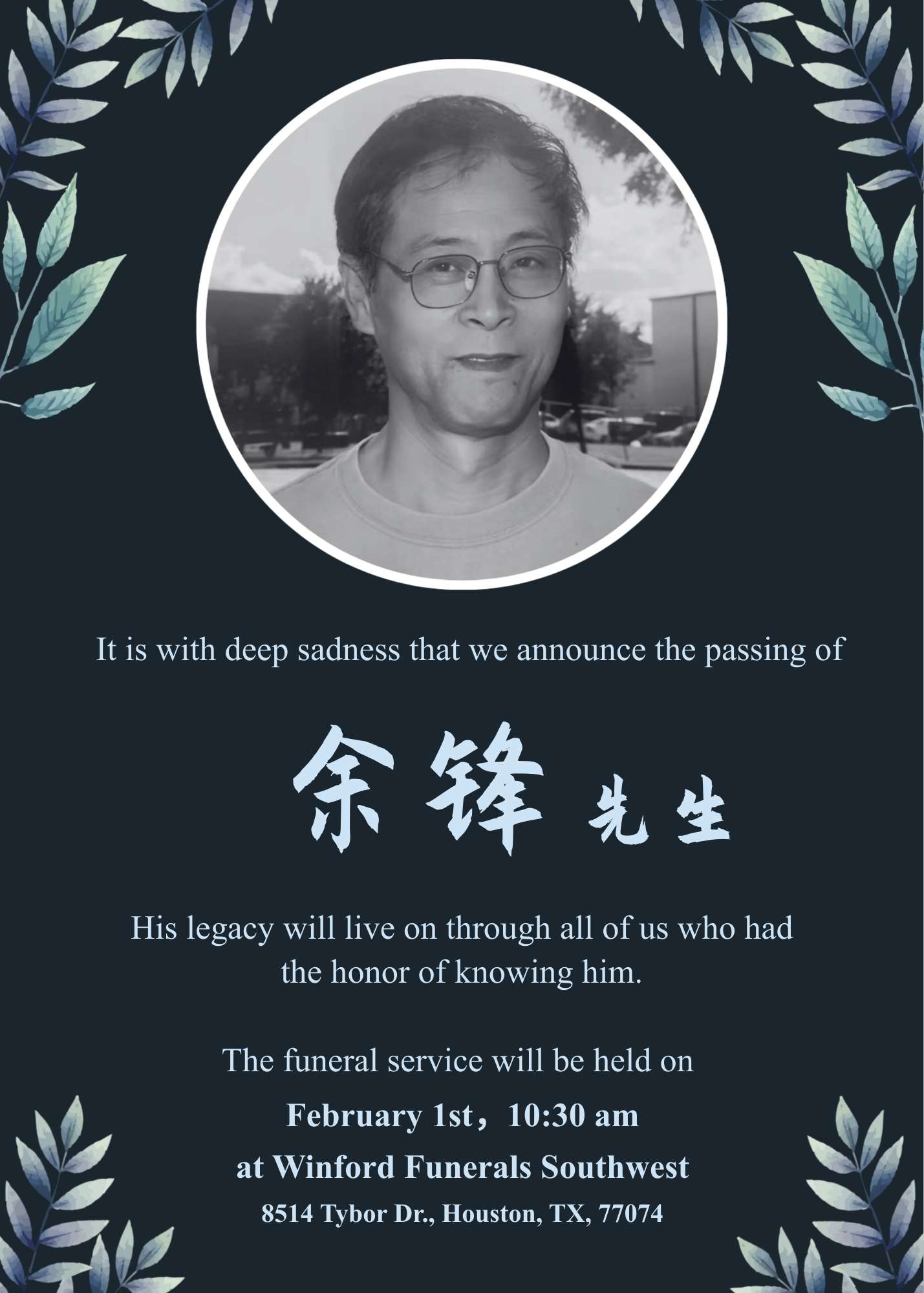 余锋先生的追思会将于2026年2月1日周日上午10.30到中午12.30在永福殡仪馆隆重举行,地点 8514 Tybor Drive, Houston;有关余锋追思会有关信息及安排联系人 Jane:832-266-8172。