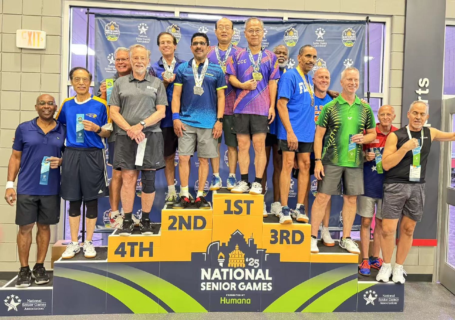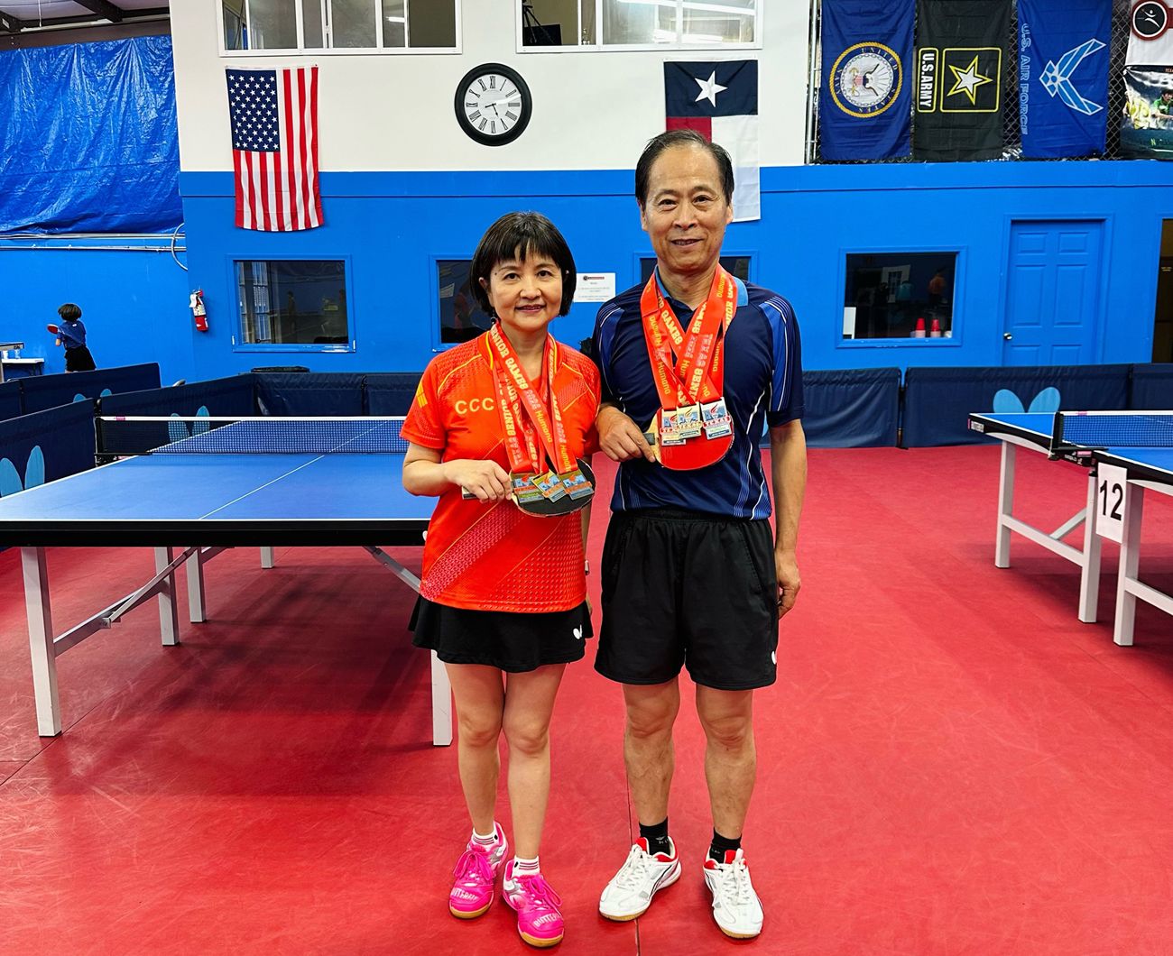 2023年我组织的华夏社团杯比赛中,余锋率队代表华夏出战,奋力拼搏;同年CCC双打比赛,他与队友勇夺冠军,我与搭档拼得季军,赛后大家一同用餐,分享胜利的喜悦。2024年,我与余锋搭档混双,赴圣安东尼奥参加德州老年乒乓球比赛并荣获冠军,赛后开心地佩戴奖牌合影留念。还有太多太多的宝贵回忆。