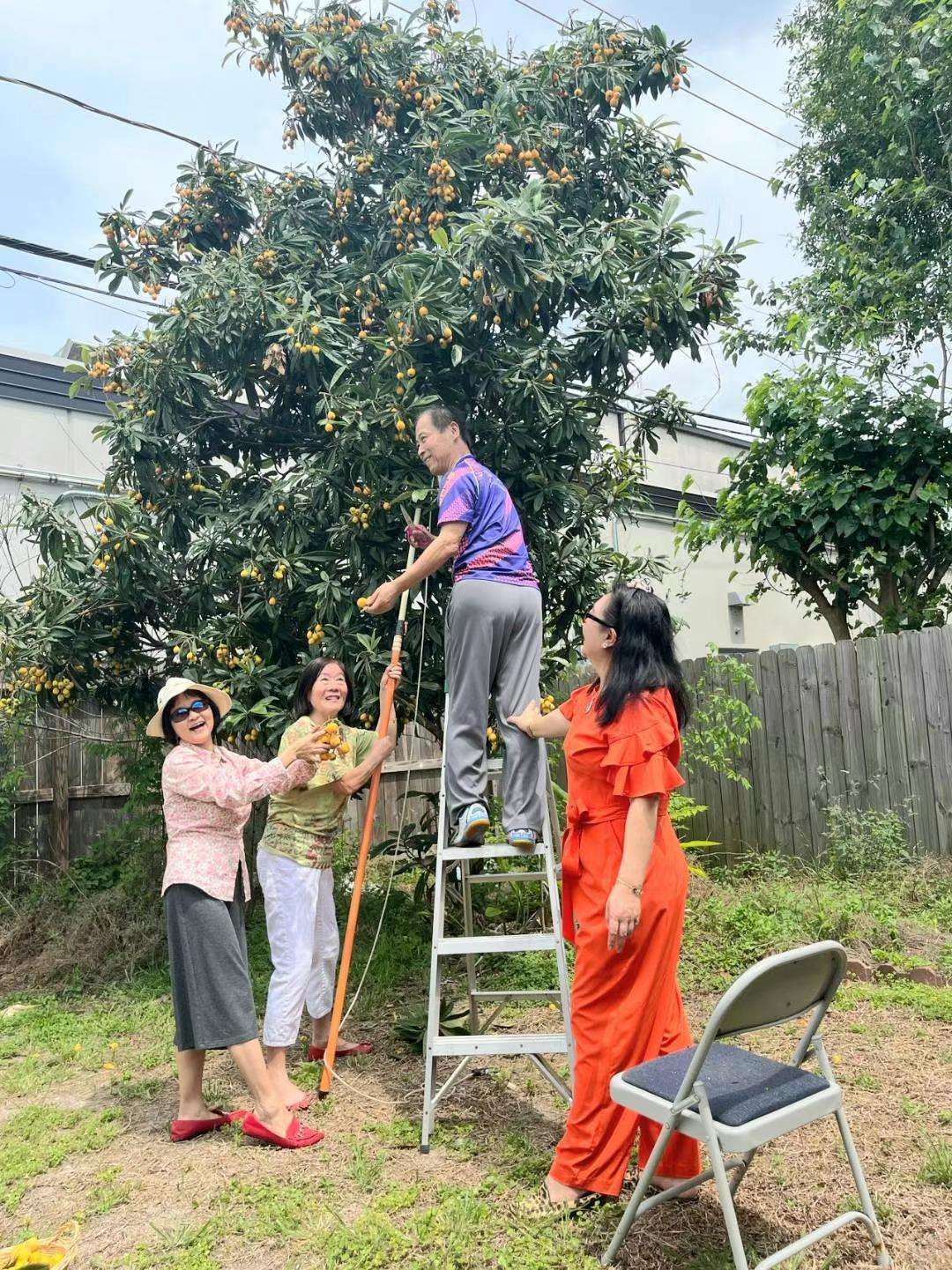我的水平低,他也愿意陪我练球,我心存感激。休斯顿中华长青乒乓球协会聚餐后,我邀请球友到家里摘枇杷,他举着长杆,爬上树,我们几个女生在地下捡果子,开心的一天。