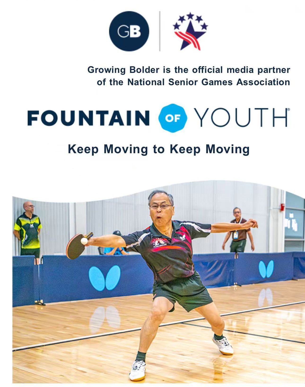美国国家老年运动会乒乓球比赛现场记者抓拍的余锋比赛画面-刊登在其官方媒体封面