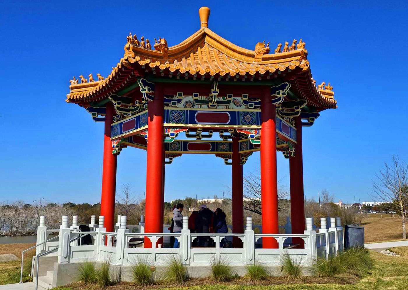凉亭座落在公园内的湖畔,亭顶呈多层起翘的重檐歇山式轮廓,飞檐