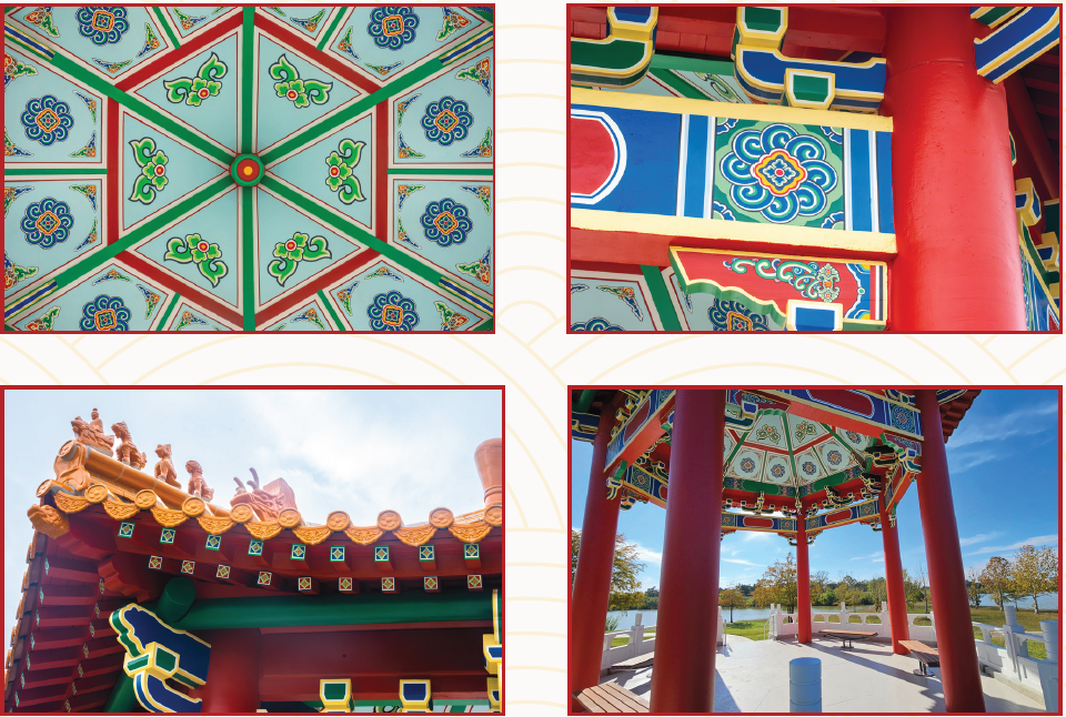 整体色彩以朱红色立柱搭配金黄色琉璃瓦屋顶为主,辅以青绿、