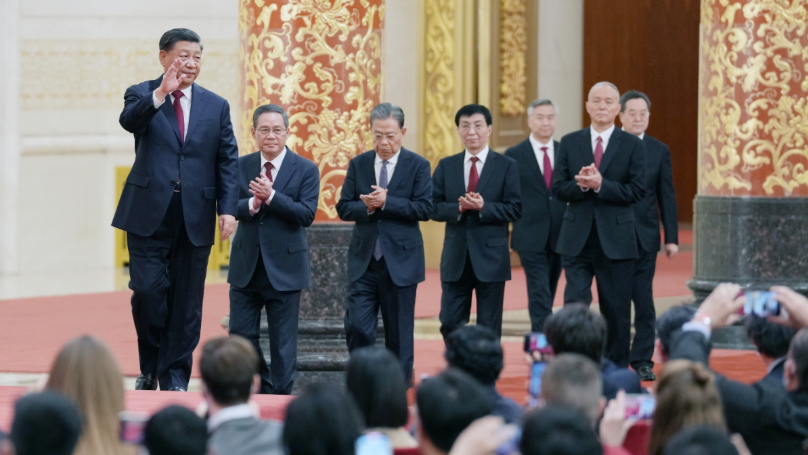 23日,在中国共产党第二十届中央委员会第一次全体会议上当选的中共中央总书记习近平和中共中央政治局常委李强、赵乐际、王沪宁、蔡奇、丁薛祥、李希在北京人民大会堂同中外记者亲切见面。(图片来源:中新社)