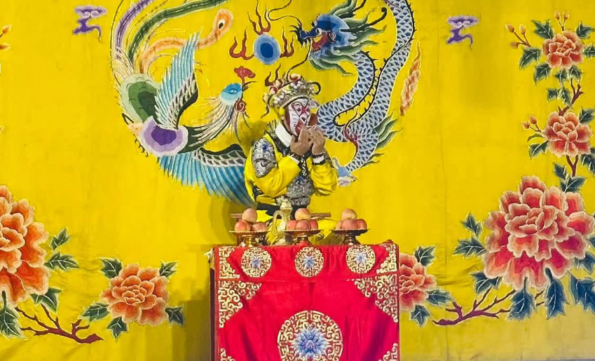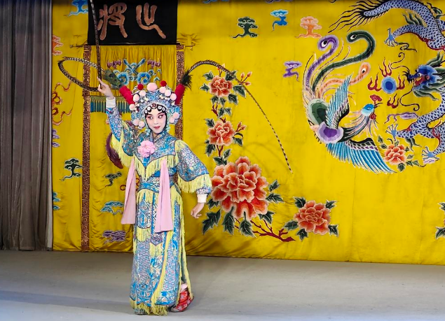 据风雷京剧团团长介绍,舞台中黄色的背景画布,集中体现了中国传统文化元素,龙凤呈祥和富贵牡丹图案寓意吉祥美好。左右两边是写有“出将”、“入相”的门帘。“出将”是演员(尤其是武将)出场的门;“入相”是演员(尤其是文官或功成名就者)完成舞台表演下场的门。